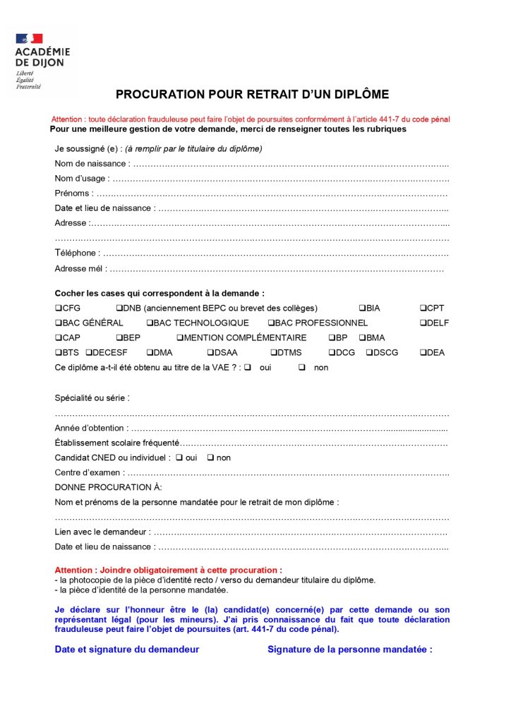 Si vous n’êtes pas en mesure de vous déplacer, vous pouvez autoriser une tierce personne à aller récupérer votre diplôme pour vous, en lui remettant une procuration signée par vous-même accompagnée d’une copie de votre carte d’identité.